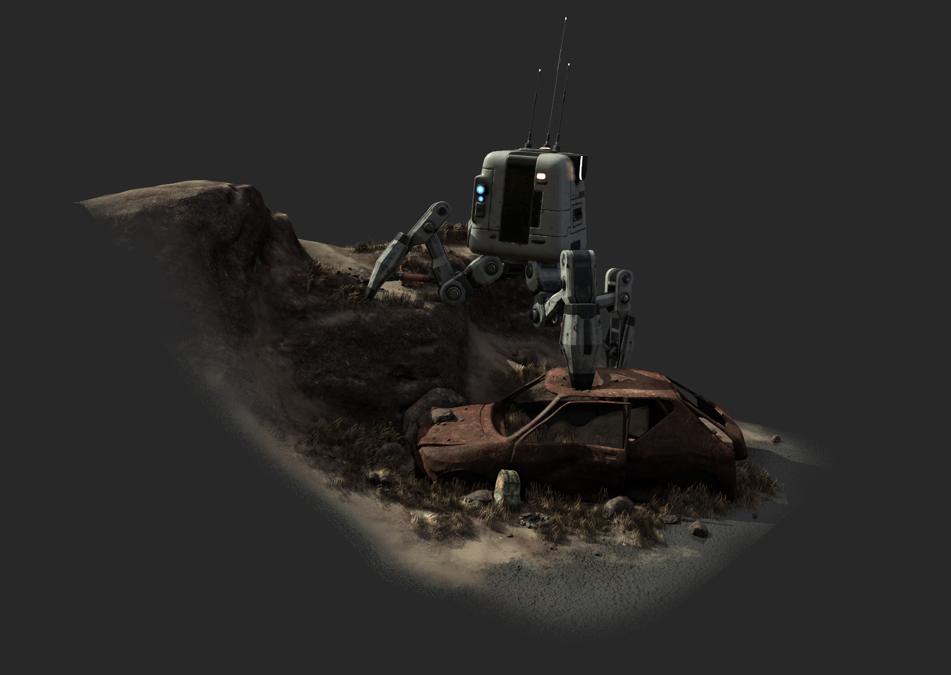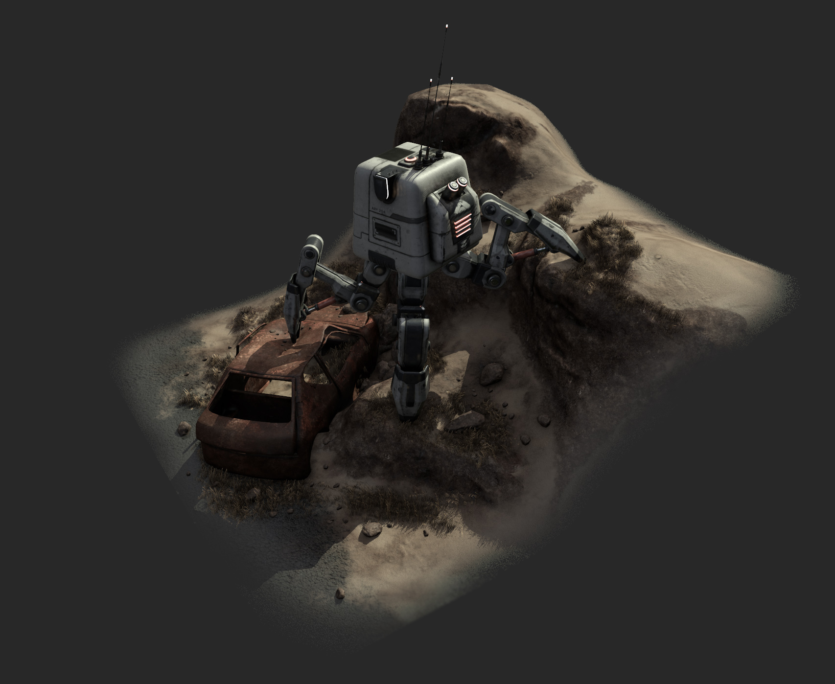 I designed this robot for a re-imagined top-down post-apocalyptic RPG, no franchise in mind, more than what I had in my head at the time of sketching it up. Modelled with 3D Studio Max, textured with dDo and rendered in Marmoset Toolbag 2.